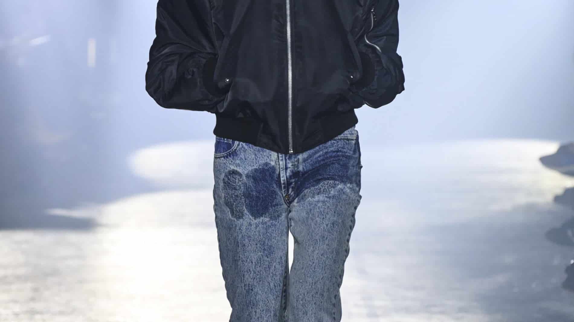 La rivoluzione del jeans non è finita. Dopo i modelli strappati, scoloriti, stropicciati, tagliati, sfrangiati, stampati, arricchiti di inserti e ricami, borchie, catene e brillantini ecco arrivare una nuova rivisitazione. E’ il denim con le finte ‘macchie di pipì’ creato dagli stilisti del brand londinese Jordanluca, per ora nella collezione maschile, in due varianti: chiazze chiare e chiazze scure all’altezza del cavallo.